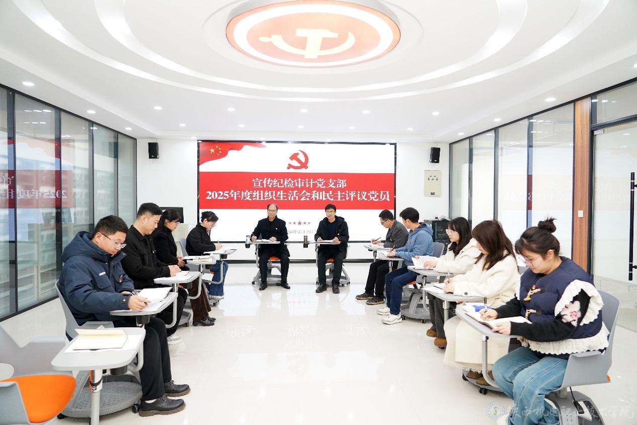 3月19日下午,宣传纪检审计党支部在蟠龙校区图书馆思政课虚拟仿真教室召开2025年度组织生活会和开展民主评议党员工作,支部全体党员参会,党委书记伊逊智到会指导,宣传纪检审计党支部书记李明主持。